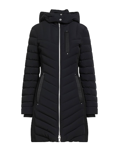 down coat, shell, quilted, stretchy fabric, brand logo, two-tone, hooded, long sleeves, goose down interior, heavyweight padding, zipper fastening, multipockets, contains non-textile parts of animal origin, hand wash or dry clean, do not tumble dry