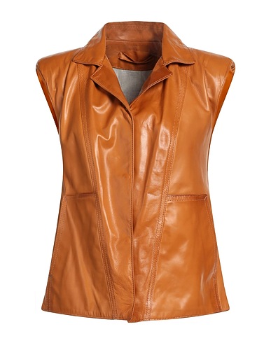 leather, no appliqués, solid color, lapel collar, single-breasted , sleeveless, fully lined, snap buttons fastening, multipockets, contains non-textile parts of animal origin, single-breasted jacket