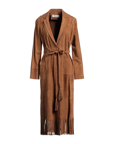 overcoat, suede, solid color, fringes, belt, lapel collar, single-breasted , long sleeves, unlined, snap fastenings, multipockets, contains non-textile parts of animal origin