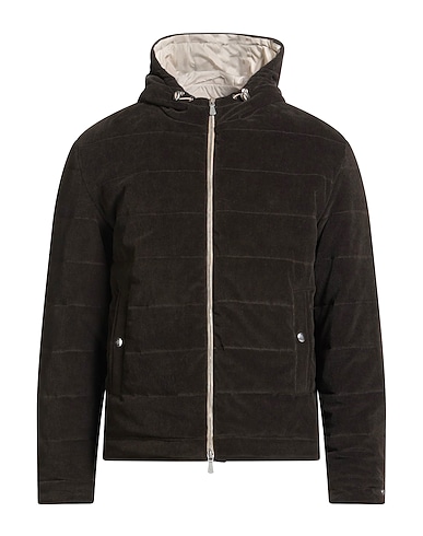 down jacket, corduroy, quilted, solid color, no appliqués, hooded, long sleeves, snap-fastening cuffs, duck down filling, zipper fastening, multipockets, stretch, contains non-textile parts of animal origin, hand wash, do not bleach, do not tumble dry, do not iron