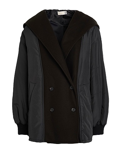 double-breasted coat, felt, shell, knitted trims, solid color, hooded, long sleeves, synthetic filling, lightweight padding, button fastenings, slit pockets, zipper pocket, dry clean, do not tumble dry