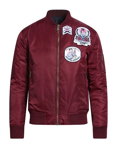 bomber jacket, shell, solid color with appliqués, patches, brand logo, knitted trims, long sleeves, synthetic filling, lightweight padding, zipper fastening, zipped pockets, machine wash or dry clean, do not bleach, do not tumble dry