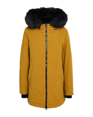 parka, shell, knitted trims, plush trims, solid color, hooded, long sleeves, fully lined, zipper fastening, slit pockets, dry clean, do not bleach, do not tumble dry, do not iron