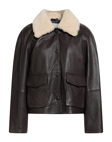 casual jacket, leather, shearling trim, solid color, long sleeves, synthetic filling, lightweight padding, button fastenings, bellows pockets, contains non-textile parts of animal origin, do not wash, do not bleach, do not tumble dry, do not iron