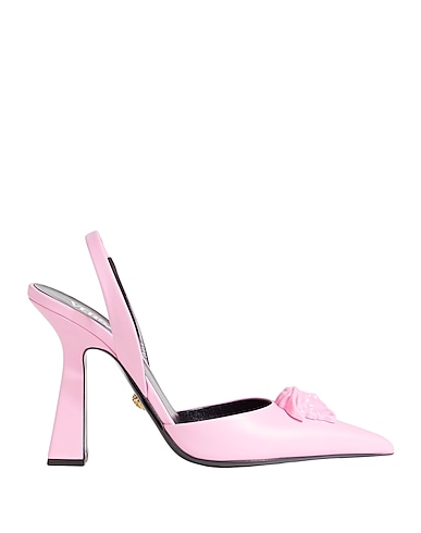 satin, brand logo, solid colour with appliqués, leather backing, elasticized straps, narrow toeline, geometric heel, leather sole, contains non-textile parts of animal origin, slingback pumps