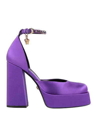 pumps, satin, solid color with appliqués, brand logo, crystals, leather lining, buckle-fastening ankle strap, square toe, square heel, covered heel, leather sole, contains non-textile parts of animal origin