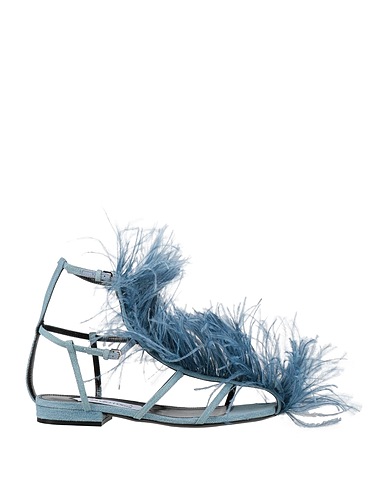 denim, feathers, solid color, leather backing, wrapping straps closure, round toeline, flat, leather sole, contains non-textile parts of animal origin, gladiator sandals