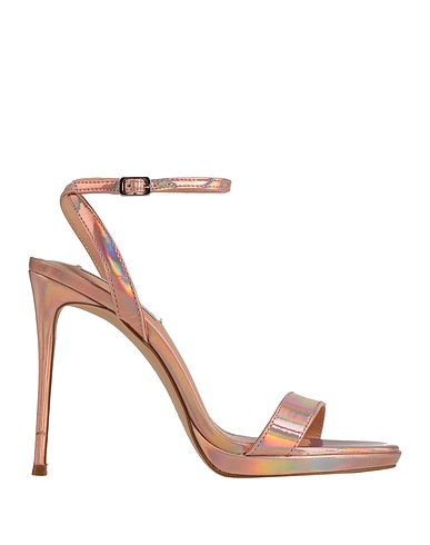 coated fabric, varnished effect, no appliqués, solid color, fully lined, buckle fastening, round toeline, stiletto heel, covered heel, rubber sole, ankle strap sandal