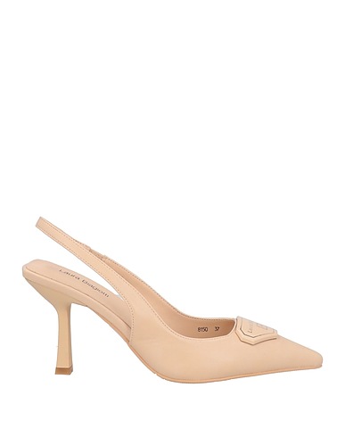 coated fabric, brand logo, solid color, fully lined, buckle fastening, narrow toeline, spool heel, rubber cleated sole, slingback pumps