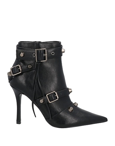 coated fabric, strap detailing, studs, solid color with appliqués, fabric inner, zipper closure, narrow toeline, spike heel, rubber sole, ankle boots