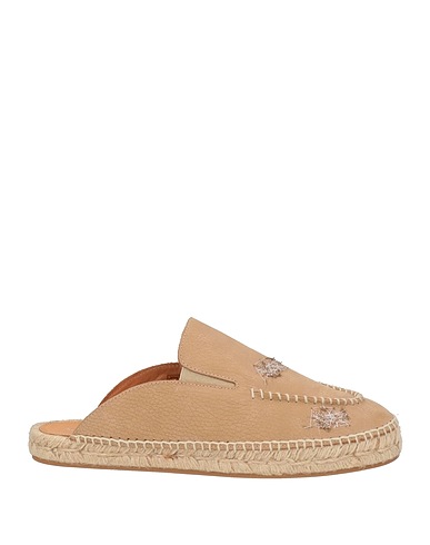 espadrille sandals, leather, solid color with appliqués, embroidered, round toe, flat, rubber sole, leather lining, contains non-textile parts of animal origin