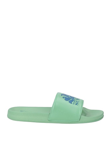 coated fabric, brand logo, solid color, rubber lining, round toe, flat, rubber cleated sole, pool slides
