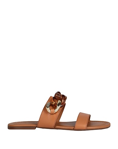 leather, embellished, brand logo, solid color with appliqués, leather lining, round toe, flat, rubber sole, contains non-textile parts of animal origin, sandals