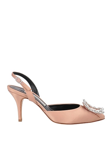 satin, crystals, solid color with appliqués, leather lining, buckle fastening, pointed toe, spike heel, leather sole, contains non-textile parts of animal origin, slingback pumps