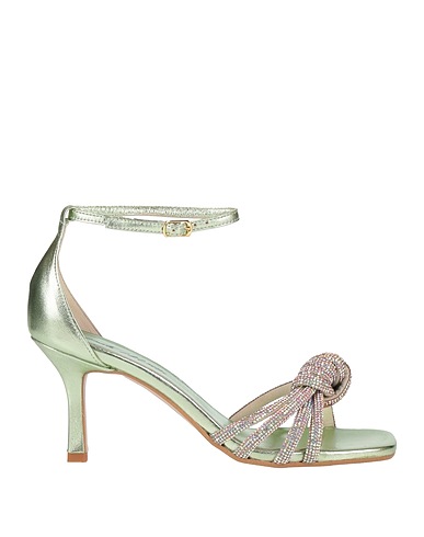 leather, metallic, crystals, solid color with appliqués, leather lining, buckle-fastening ankle strap, square toe, spool heel, covered heel, rubber sole, contains non-textile parts of animal origin, ankle strap sandals