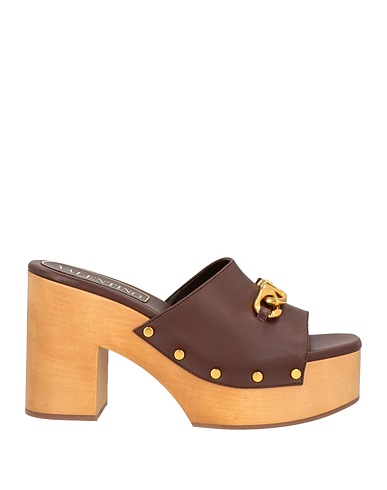 sandals, leather, solid color with appliqués, brand logo, square toe, block heel, rubber sole, leather lining, contains non-textile parts of animal origin
