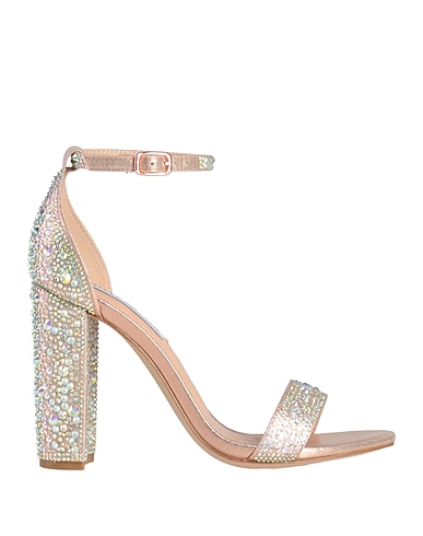 woven, crystals, iridescent, fabric inner, buckle-fastening ankle strap, round toe, square heel, rubber cleated sole, ankle strap sandals