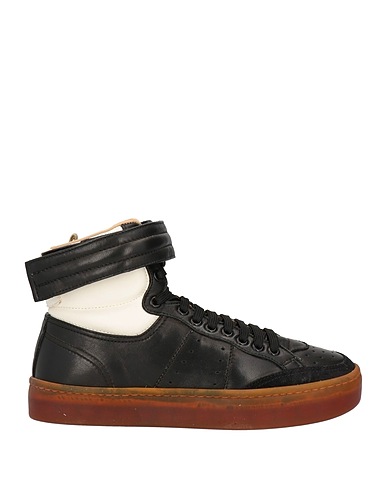 high-top sneakers, leather, brand logo, two-tone, leather lining, velcro fastening, lace-up, round toe, flat, rubber cleated sole, contains non-textile parts of animal origin