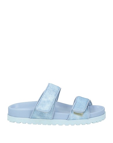 denim, leather, no appliqués, solid color, leather lining, velcro fastening, round toe, flat, rubber cleated sole, contains non-textile parts of animal origin, technical sandals