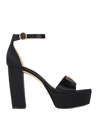 satin, brand logo, solid color, leather lining, buckle-fastening ankle strap, round toe, square heel, covered heel, rubber sole, contains non-textile parts of animal origin, ankle strap sandals