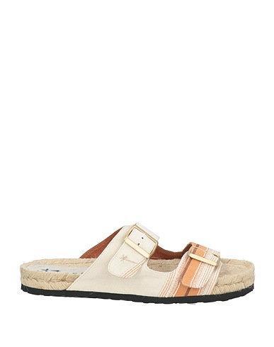 canvas, brand logo, striped, fabric inner, buckle fastening, round toe, flat, rubber sole, espadrille sandals