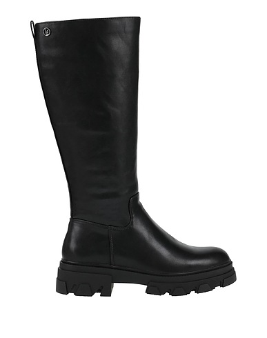 boots, synthetic material, solid color, brand logo, fabric inner, zipper fastening, round toe, square heel, rubber cleated sole