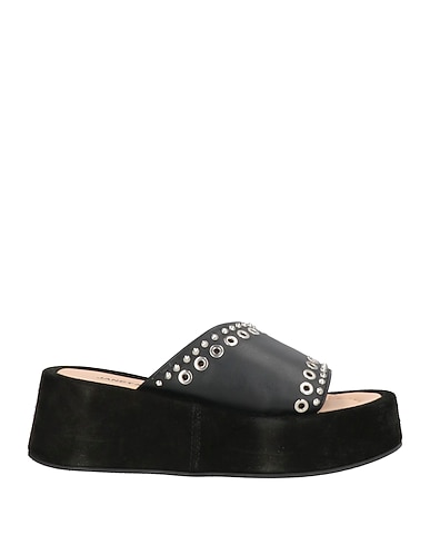 leather, studs, solid color with appliqués, leather lining, round toe, wedge heel, rubber sole, contains non-textile parts of animal origin, slide sandals