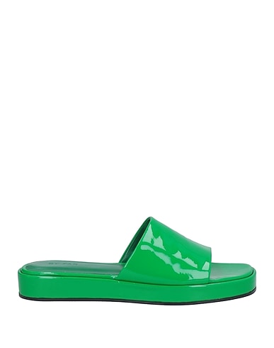 slide sandals, patent leather, no appliqués, solid color, leather lining, square toe, flat, rubber sole, contains non-textile parts of animal origin