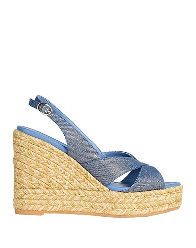 espadrille sandals, denim, metallic, solid color, no appliqués, leather lining, buckle-fastening ankle strap, round toe, wedge heel, rubber sole, contains non-textile parts of animal origin