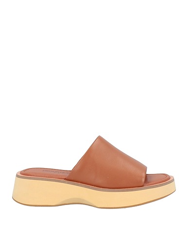 slide sandals, leather, solid color, no appliqués, leather lining, round toe, wedge heel, rubber wedge, rubber cleated sole, contains non-textile parts of animal origin