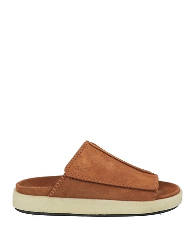 slide sandals, suede, solid color, brand logo, leather lining, round toe, flat, rubber cleated sole, contains non-textile parts of animal origin