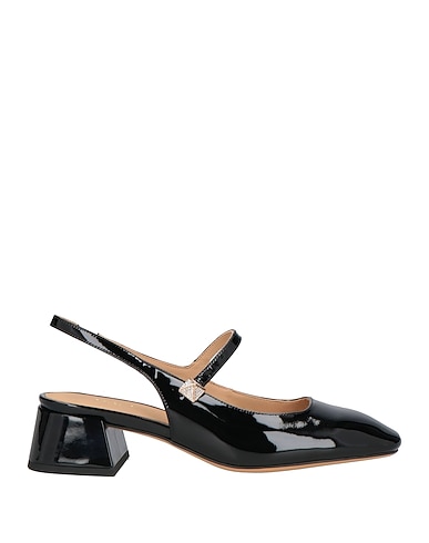 slingback pumps, patent leather, solid color, crystals, button-embellished, leather lining, square toe, square heel, covered heel, rubber sole, contains non-textile parts of animal origin
