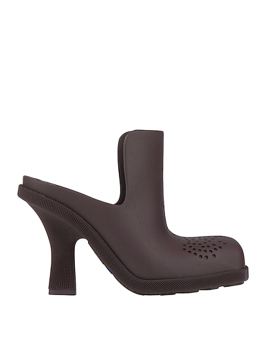 mules, rubber, solid color with appliqués, brand logo, unlined, pointed toe, square heel, rubber sole