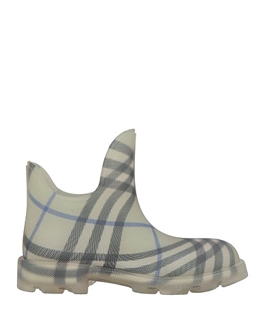rain ankle boots, plastic, signature print, no appliqués, unlined, round toe, square heel, rubber cleated sole, small sized
