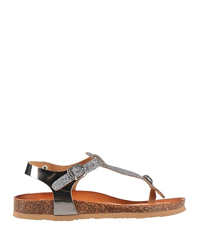 technical thong sandals, leather, metallic, solid color, glittered, leather lining, buckle fastening, round toe, flat, rubber cleated sole, contains non-textile parts of animal origin