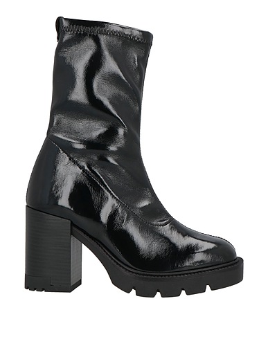 sock ankle boots, coated fabric, patent-effect, solid color, no appliqués, leather lining, round toe, square heel, rubber cleated sole, contains non-textile parts of animal origin