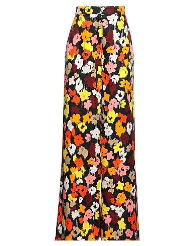 satin, no appliqués, floral design, multicolor pattern, high waisted, flared cut, regular fit, zipper closure, hook-and-eye closure, multipockets, chinos