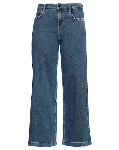 denim, studs, leather applications, solid color, medium wash, high waisted, belt loops, flared cut, comfort fit, zipper closure, 1 button, multipockets, contains non-textile parts of animal origin, flare & wide-leg