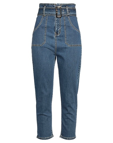 denim, belt, solid color, medium wash, high waisted, belt loops, tapered leg, slim-leg pants, zipper closure, multipockets, mom-cut model