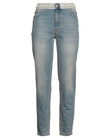 denim, faded, beads, rhinestones, solid colour with appliqués, medium wash, high waisted, tapered leg, regular fit, zipper closure, 1 button, multipockets, straight-leg model