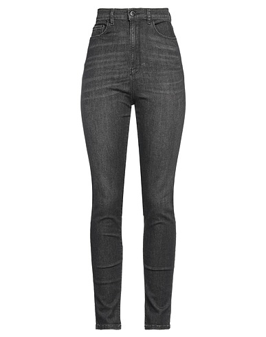 denim, faded, leather applications, brand logo, solid color, colored wash, high waisted, tapered leg, slim-leg pants, zipper closure, 1 button, multipockets, stretch, contains non-textile parts of animal origin, skinny model