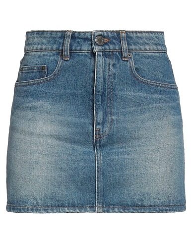flared skirt, denim, faded, solid color, brand logo, medium wash, zipper fastening, button fastenings, multipockets