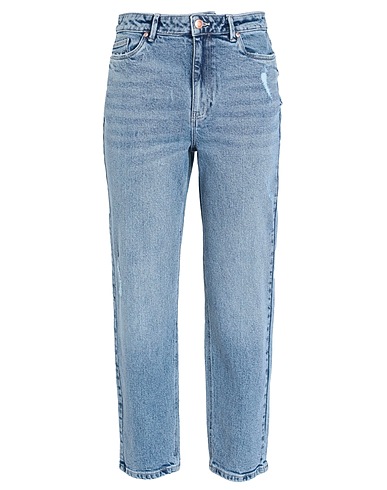 denim, faded, worn effect, brand logo, solid color, medium wash, high waisted, tapered leg, slim-leg pants, zipper closure, 1 button, five pockets, mom-cut model