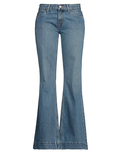 flared jeans, denim, faded, solid color, brand logo, medium wash, mid rise, flared leg, regular fit, zipper fastening, 1 button, pockets