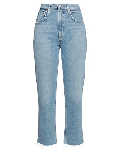 denim, faded, brand logo, leather applications, solid color, medium wash, high waisted, 1 button, zipper closure, multipockets, contains non-textile parts of animal origin, tapered model