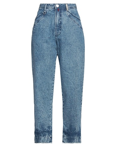 tapered jeans, denim, faded, leather trims, brand logo, solid color, medium wash, high waisted, belt loops, tapered leg, regular fit, 1 button, zipper fastening, multipockets, contains non-textile parts of animal origin