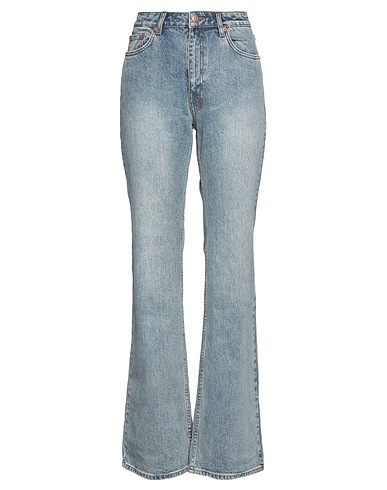 denim, faded, brand logo, solid color, medium wash, high waisted, zipper closure, button closing, multipockets, flare & wide-leg