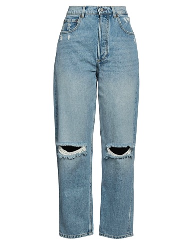 boyfriend jeans, denim, distressed, faded, solid color, brand logo, light wash, high waisted, belt loops, tapered leg, regular fit, button fastenings, pockets