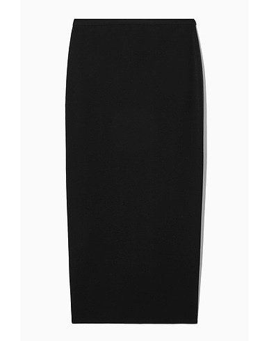 crepe, no appliqués, solid color, unlined, zipper closure, hook-and-eye closure, rear slit, no pockets, stretch, pencil style