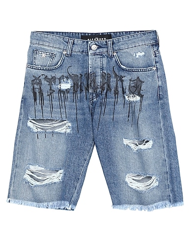 shorts, denim, faded, solid color with appliqués, print, medium wash, mid rise, belt loops, 1 button, concealed button fastenings, fringed hem, relax by the pool or vacation at the beach in style with this effortless summer holiday outfit